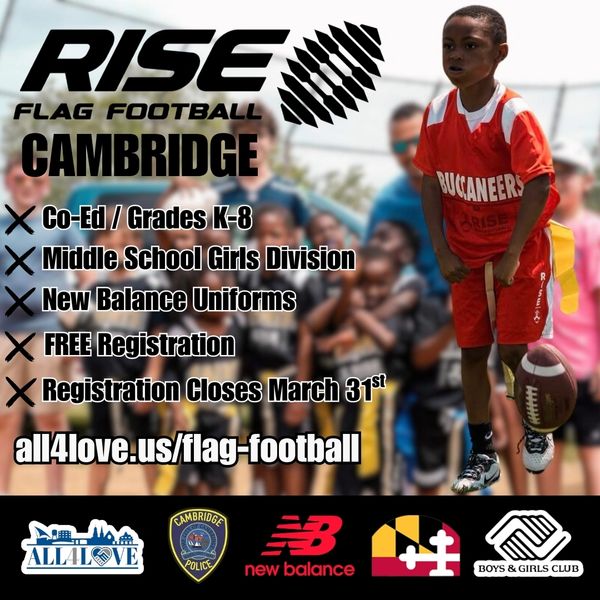 RISE Flag Football is proud to announce its collaboration with the State of Maryland's Governor's Office of Crime Prevention and Policy, the All4Love, the Cambridge Police Department, and The Boys & Girls Club.